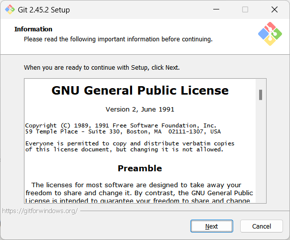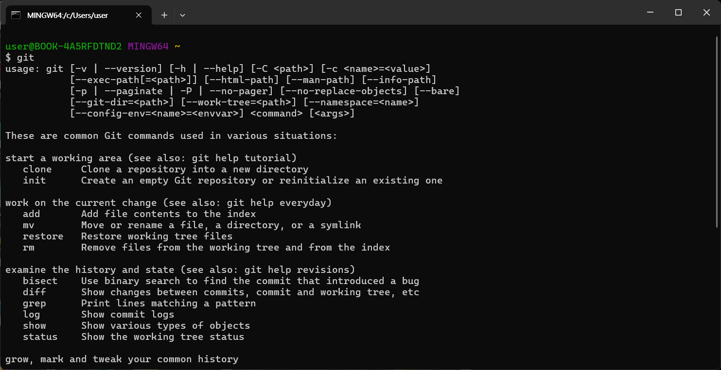 설치후에 [Git Bash]를 클릭해서 실행한다음에 $git을 입력 후 엔터를 치면 다음과 같이 여러 옵션이 나타나면 깃이 설치된 것이다.