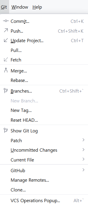 [VCS]를 누르고 [Create Git Repository]을 누르고 Git저장소로 만들 프로젝트를 선택한다. Git을 설치해야만 성공적으로 작동된다.