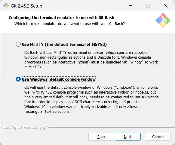 터미널 에뮬레이터를 윈도우 명령 프롬프트 창을 사용하기 위해 다음과 같이 선택하였다.