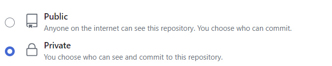 [Repository name] 저장소 이름을 넣어주고 [Public/Private]에서 원하는 방식을 선택한다.