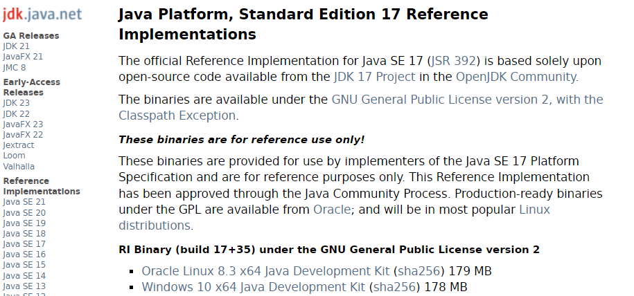 나는 JDK 17버전을 설치할 것이다. 왼쪽 메뉴버튼에서 Javs SE 17을 클릭하고 WINDOW 10 x64 java Development Kit(sha256)을 클릭하고 설치한다.