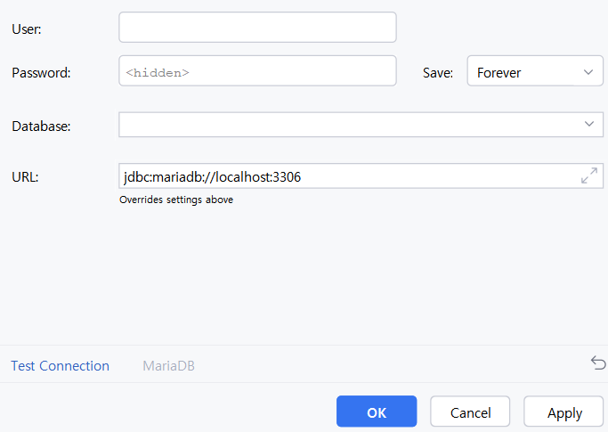 위에서 생성한 [User][password]를 작성해주고, 생성한 [Database]를 작성해준다.