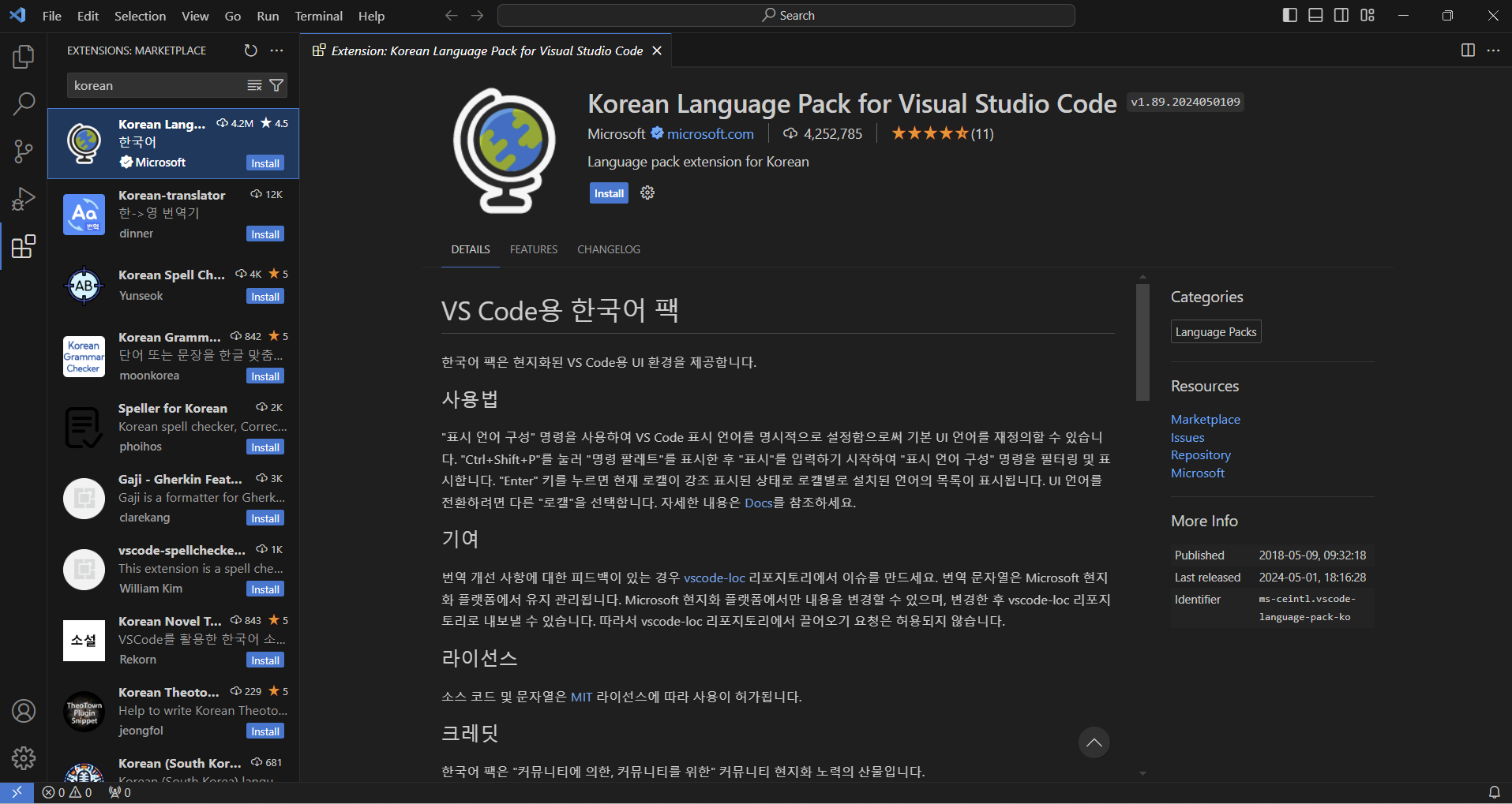 검색창에 [korean]을 검색하면 [Korean Language Pack for Visual Studio Code]가 있는데 누른다음 [Install]을 누르면 설치된다.
