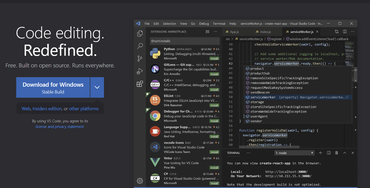 Visual Studio Code is a code editor redefined and optimized for building and debugging modern web and cloud applications. Visual Studio Code is free and available on your favorite platform - Linux, macOS, and Windows.