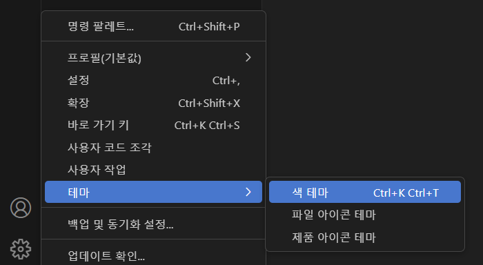 왼쪽 아래에 아이콘을 클릭한 뒤 [테마]를 누른다음 [색 테마]를 클릭하면 원하는 색 테마로 변경이 가능하다.