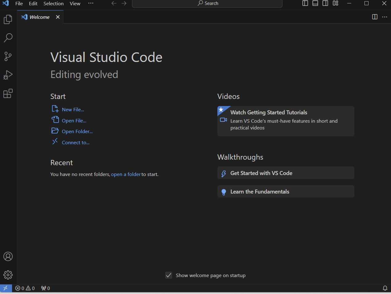 만약 [show welcome page on startup]을 체크해제하면 다음부터는 [Welcome]시작페이지가 보이지 않는다.