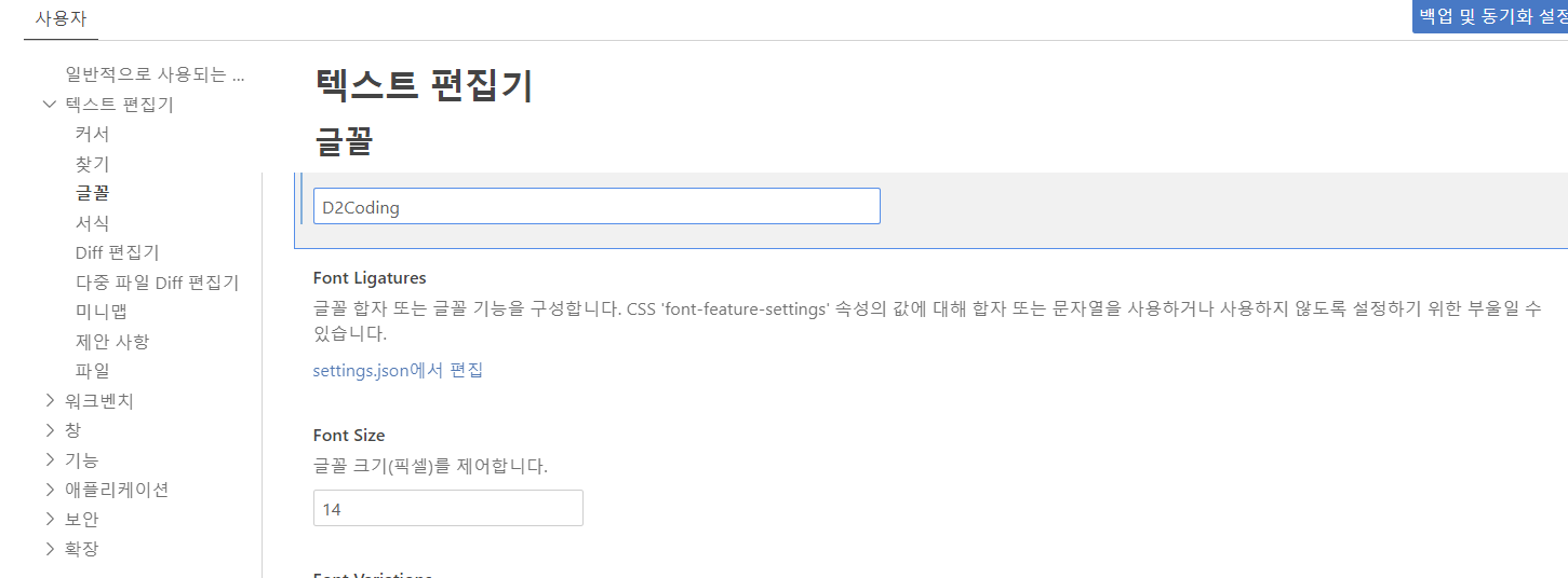[텍스트 편집기]에서 [글꼴]을 선택 한 뒤 [Font Family]안에 내용을 삭제하고 [D2Coding]을 작성하면 적용된다..